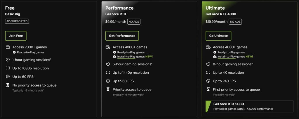 GeForce Now offers three membership tiers: Free, Performance, and Ultimate, allowing Mac users to choose the level of performance and features that best match their gaming needs.